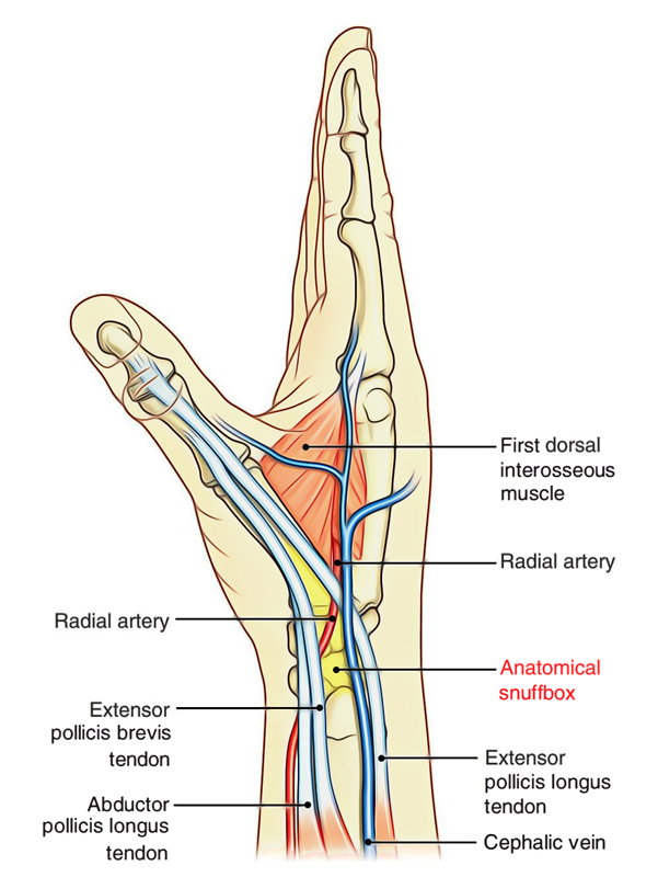 위 그림에서 빨갛게 표시된 해부학적 코담배갑(anatomical snuffbox) 부위의 염증과 통증이 있습니다.