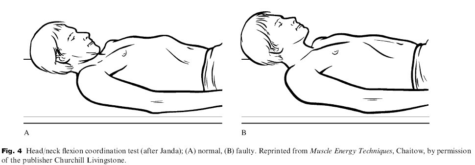 - overactivity의 평가는 앙와위에서 머리를 굴곡시켜보는 것입니다. (Janda) 우측은 SCM이 과활성화된 것입니다.