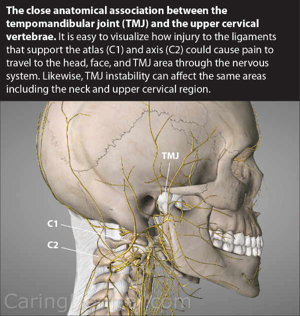 - 턱관절(TMJ)은 atlanto-occipital joint, C1-C2 joint 등 상부경추가 운동의 축이 됩니다. 따라서 상부경추의 문제는 턱관절을 같이 살펴보아야합니다. 그 역도 마찬가지입니다.