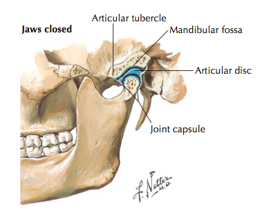 디스크는 위로는 temporal bone의 mandibular fossa와, 아래로는 mandible의 condyle과 맞닿아있습니다.