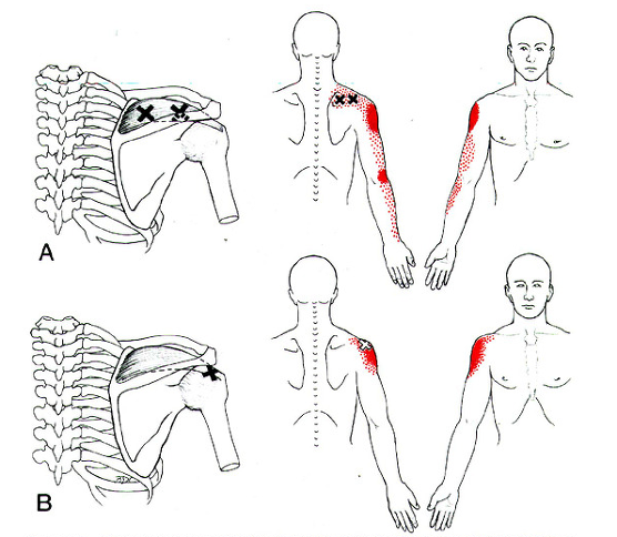 - 근복부의 TrP는 어깨, 팔꿈치, 드물게는 손목까지 방사되기도 한다.