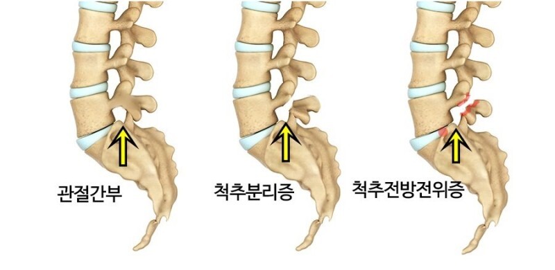 척추 전방전위증(spondylolisthesis)은 척추 분리증(Spondylolysis)이 선행됩니다.