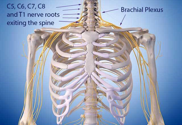 "상완신경총(brachial nerve plexus)"은 목에서 팔로 이어지는 복잡한 신경 얼기를 말한다.