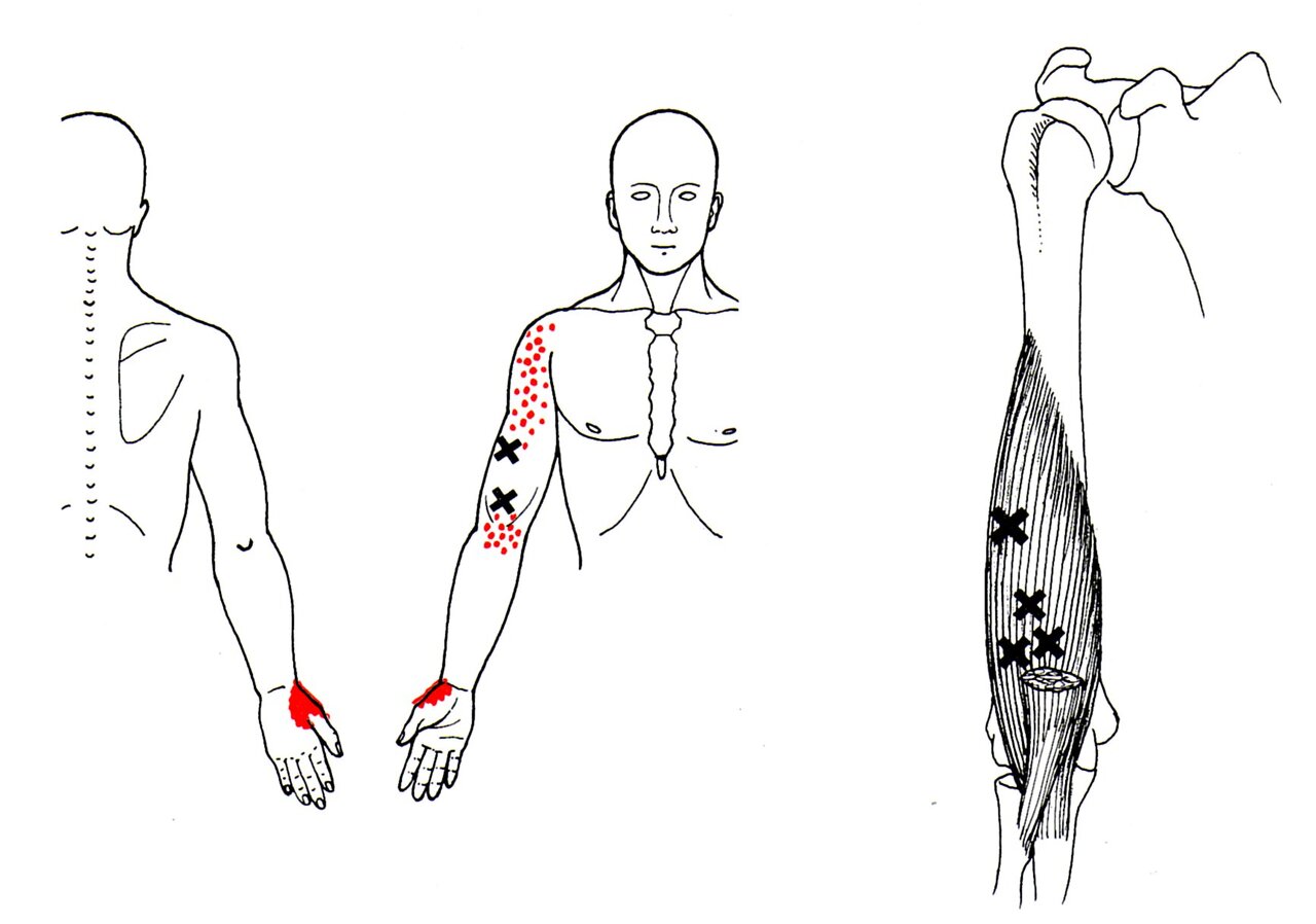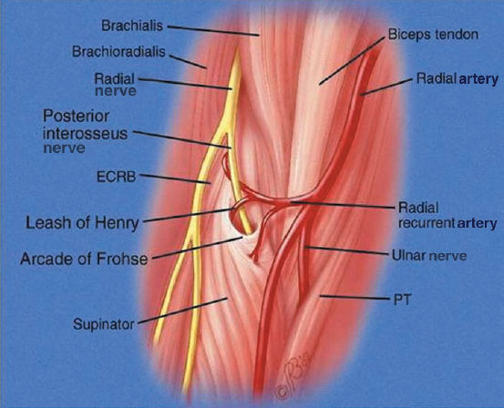 - brachialis 와 brachioradialis 사이에서 radial nerve가 entrapment된다.