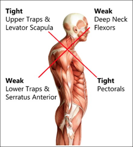 우리는 지금 거북목을 보고 있으므로, 상부교차 증후군을 살펴봅시다.