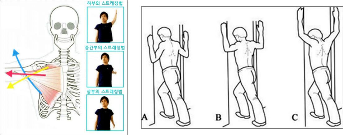 A는 대흉근의 복근지, B는 대흉근의 흉골지 스트레칭이 되고