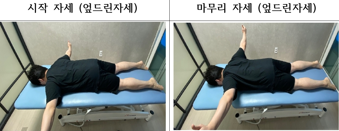 이런 식으로 엎드린 자세에서 팔을 뒤로 들어올립니다.