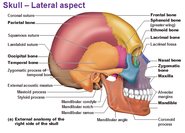 | Lateral aspect of skull | Squamous suture - between the parietal bone and temporal bone Sphenofrontal suture - between the frontal bone and sphenoid bone Sphenoparietal suture - between the sphenoid bone and parietal bone Occipitomastoid suture - between the occipital bone and mastoid process of the temporal bone Temporozygomatic suture - between the temporal bone and zygomatic bone |