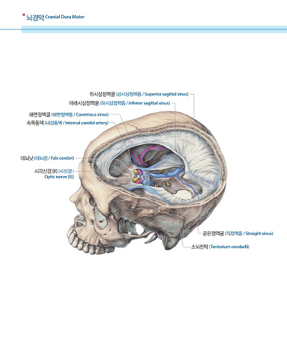 대뇌겸, 소뇌천막, 경추경막이 상호 긴장막(RTM)을 이룬다.