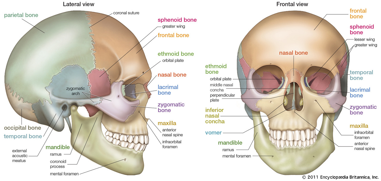두개골(skull)은 다시 뇌머리뼈(cranial bone)와 얼굴뼈(facial bone)로 나뉜다.