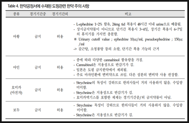 스포츠 한의학회지의 "한약의 도핑관리" 중 발췌하였습니다.