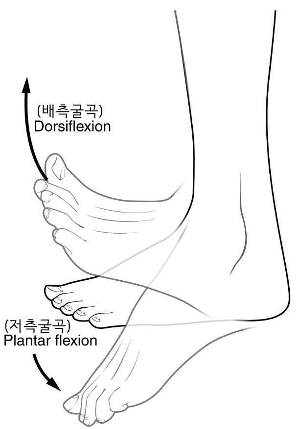 한자어로는 배측굴곡, 족저굴곡인데 발등쪽으로 굽히느냐 / 발바닥쪽으로 굽히느냐의 차이이다.